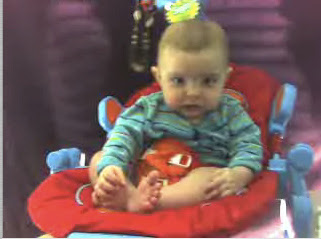 Well it's been a busy week in the life of the D. On Monday night at Christine's he started to consistently wave at me when I waved at him and also seemed to realize how pleased Christine and I were with his prowess. No doubt this had something to do with the squeals of glee coming from both of us each time he raised his hand and waved it around in response to my doing so. Needless to say he seemed very pleased himself, smiling and slamming his fist stuffed mouth and whole face into Christine's bosom each time we acknowledged his skills with a huge grin and an irrisistable expression on his face.